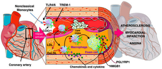 TREM-1 plays a critical role in CVDs by influencing myelopoiesis and inflammatory responses, as shown in Figure 3. The development of arterial atheroma and its instability are linked to TREM-1 overexpression. TREM-1 contributes to the expansion and instability of atherosclerotic plaques, which can be seen clinically as either coronary artery disease (CAD) or angina when the coronary is partially blocked or atherosclerotic myocardial infarction (AMI) when it is fully blocked. Additionally, TREM-1 is linked to an increased risk of endocarditis. Within the systemic circulation, TREM-1 skews hematopoietic differentiation towards monocyte production. In monocytes, transmembrane TREM-1 is activated by its ligands, including PGLYRP1, HMGB1, or LPS. This activation leads to the activation of NFκB, which in turn, promotes the transcription of genes encoding pro-inflammatory cytokines, chemokines, and various cell surface molecules. Additionally, TREM-1 synergizes with TLRs to amplify ILs and TNF-α release. Within atherosclerotic plaques, the upregulation of TREM-1 enhances monocyte transmigration into the intimal layer, where they encounter oxidized low-density lipoprotein (oxLDL). Upon ligand binding (e.g., PGLYRP1 from neutrophils or HMGB1 from macrophages), TREM-1 activation augments oxLDL uptake, promoting foam cell formation and contributing to atherogenesis. The activation of NFκB further drives the inflammatory response by translocating into the nucleus of macrophages, thereby perpetuating a pro-atherogenic environment. Pharmacological suppression of TREM-1 or epigenetic TREM-1 modification reduces atherosclerosis and the incidence of AMI in a mouse model with a notably low death rate, and it can also help individuals who are at risk of endocarditis inflammation [,,,,].