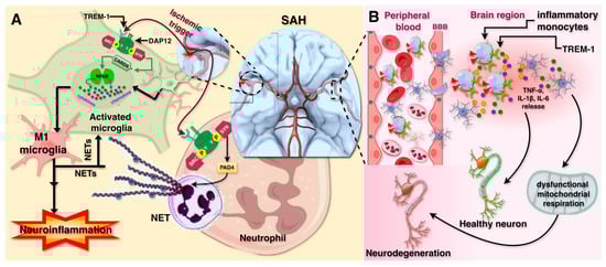 Recent studies indicate that TREM-1 may also play a significant role in various neuroinflammation-related disorders, including subarachnoid hemorrhage, Parkinson’s disease, Alzheimer’s disease and ischemia. Neuroinflammation is a critical factor in the pathogenesis of subarachnoid hemorrhage (SAH) and is associated with worsened patient outcomes. Neuroinflammation worsens neuronal injury after a subarachnoid hemorrhage (SAH). It triggers harmful events such as the release of inflammatory cytokines and disruption of the blood–brain barrier. Microglia and other immune cells become activated, amplifying the inflammatory response. These processes cause neuronal death, brain swelling, delayed cerebral ischemia (DCI) and cerebral vasospasm (CVS). As a result, patients may develop long-term cognitive deficits and irreversible brain damage []. TREM-1 and sTREM-1 are key immune response factors in the brain after SAH. Studies have identified a strong correlation between plasma as well as cerebrospinal fluid (CSF) sTREM-1 levels and poor neurological scores, with elevated sTREM-1 levels observed in patients with initial severity of SAH. However, its role in specifically predicting CVS and DCI is not well-established. sTREM-1 may serve as a marker of inflammation and disease severity in SAH []. The pathophysiology of SAH involves the activation of TREM-1 pathways in both microglia and neutrophils. Microglial activation leads to a significant increase in the expression of neuroinflammatory genes, including IL-6, IL-1β, and mediator, TNF-α, as well as genes associated with the proinflammatory microglial phenotype (CD68, CD16, CD32, CD86).