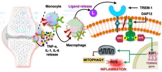 - Dai, Z.-Z.; Xu, J.; Zhang, Q.; Zhou, H.; Liu, X.-M.; Li, H. TREM1 interferes with macrophage mitophagy via the E2F1-mediated TOMM40 transcription axis in rheumatoid arthritis. Free Radic. Biol. Med. 2025, 228, 267–280. [Google Scholar] [CrossRef]