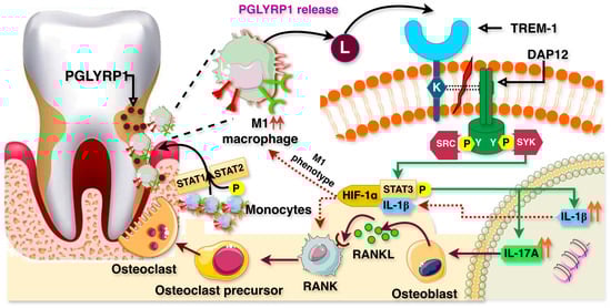 Moreover, work by Wu et al. supports the role of TREM-1 in promoting periodontal inflammation by driving M1 macrophage polarization. The newly identified STAT3-HIF1α-IL1β signaling pathway, acting downstream of TREM-1, plays a key role in regulating M1 polarization in periodontitis. Activation of TREM-1 triggers STAT3 phosphorylation via the JAK2 signaling pathway, and the activated STAT3 subsequently enhances HIF-1α expression. In periodontitis, the macrophage M1/M2 ratio significantly increases, while TREM-1 inhibition primarily suppresses M1 polarization [,,]. Notably, pharmacological inhibition of TREM-1 using the LP17 peptide resulted in a reduced RANKL/OPG ratio, downregulation of IL-17a, and a significant decrease in bone loss. These findings highlight TREM-1 inhibition as a promising therapeutic approach for periodontitis.