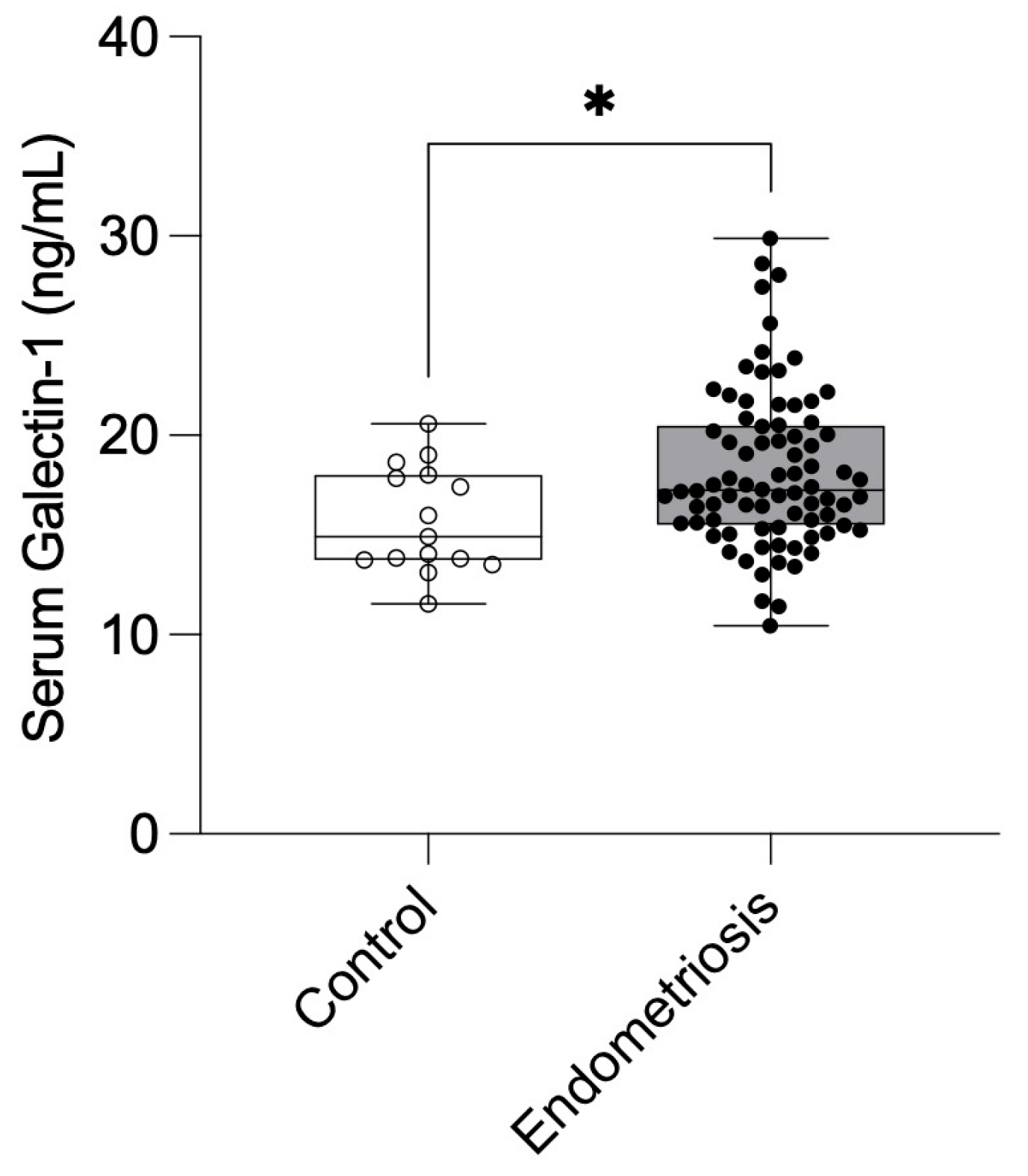 Despite these advances, the clinical utility of Gal-1 as a circulating biomarker for endometriosis remains unexplored. No study has systematically evaluated serum Gal-1 concentrations in a prospective, surgery-verified cohort or assessed its diagnostic accuracy. Therefore, this study aimed to quantify preoperative and longitudinal changes in serum Gal-1 levels in patients with histologically confirmed endometriosis compared with healthy controls, evaluate its diagnostic performance, and assess associations with preoperative symptom burden.