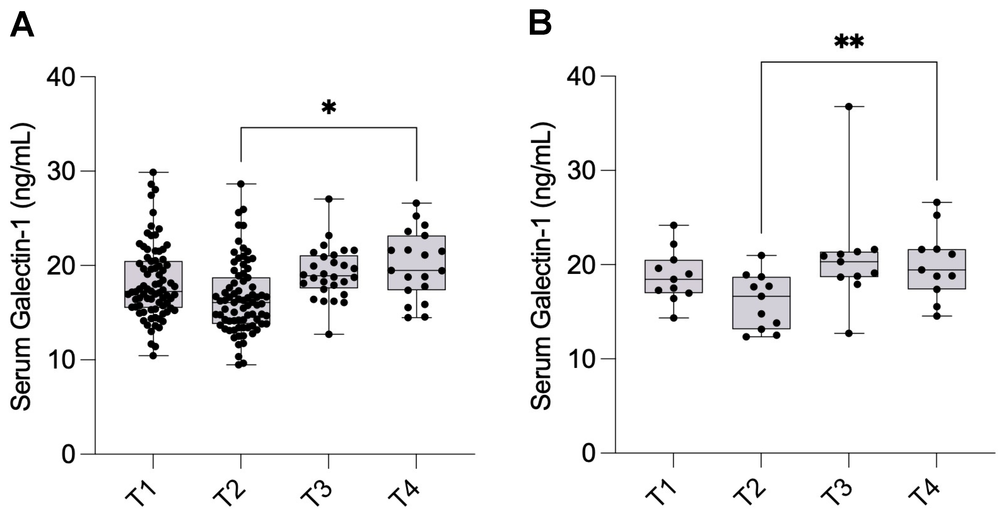 Serum samples for Gal-1 analysis were collected at four predefined time points to enable longitudinal analysis of serum Gal-1 levels over the perioperative and postoperative period: one day before surgery (T1, n = 80), one day after surgery (T2, n = 79), one month after surgery (T3, n = 28), and one year after surgery (T4, n = 19). The same patient cohort was followed prospectively throughout the study, and repeated samples were collected from each individual at all four time points. However, due to patient attrition during the follow-up period, the number of available samples decreased over time. The longitudinal design allowed for intra-individual comparison of serum Gal-1 concentrations, capturing short-term postoperative changes as well as long-term biological dynamics up to one year after surgical treatment.