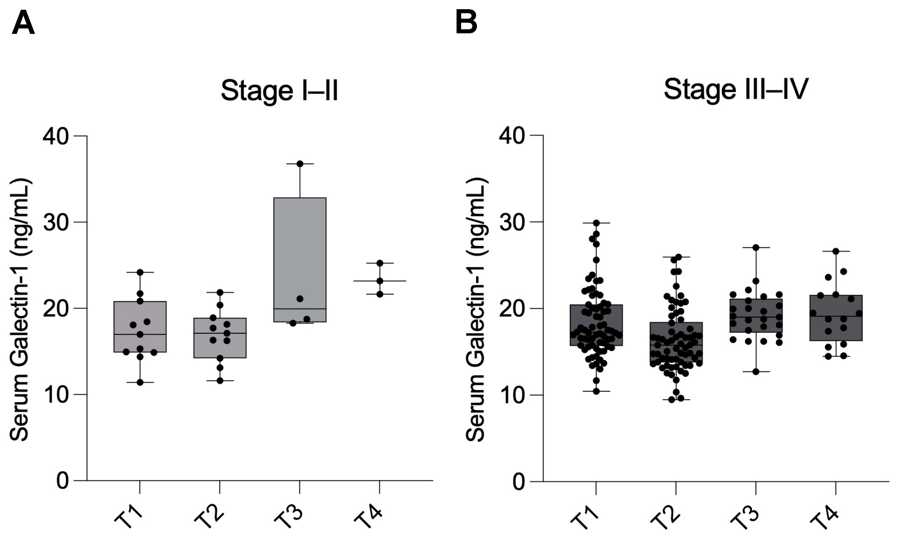 The strengths of this study include its prospective design with surgery- and histology-confirmed diagnoses, the use of a standardized ELISA protocol with clearly defined assay performance characteristics, and the inclusion of longitudinal sampling across four perioperative time points, which allowed us to assess dynamic changes in serum Gal-1 levels over time. Furthermore, we applied comprehensive diagnostic performance analyses, including ROC-based thresholds, sensitivity, specificity, and predictive values, which provide a transparent clinical framework for interpretation. Nevertheless, several limitations should be acknowledged. The control group was relatively small and lacked complete demographic data due to anonymized recruitment through the national blood bank, which limits generalizability. Attrition at later follow-up points reduced statistical power for subgroup analyses, particularly in Stage I–II disease. The study cohort was imbalanced toward Stage III–IV disease, which may have influenced overall diagnostic performance. The low specificity observed in ROC analysis indicates that serum Gal-1 alone is unsuitable for clinical application and should be viewed as a complementary rather than a standalone biomarker. Finally, our findings are based on a single-center design without external validation. The findings should be considered exploratory. Future studies should include larger, multicenter cohorts with symptomatic and healthy controls to enhance statistical robustness and external validity.