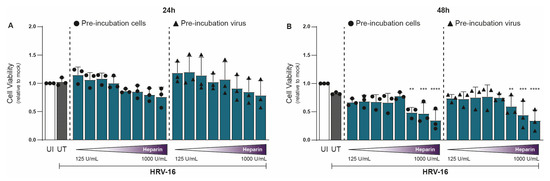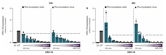 Antiviral effect of Heparin on HRV-16 infection in H1-HeLa cells. Either H1-HeLa cells (round) or HRV-16 particles (triangle) were pre-incubated with increasing concentration (125 IU/mL–1000I U/mL) of heparin (blue bar), and HRV-16 RNA expression was quantified at 24 (A) and 48 (B) hpi. using RT-PCR. Uninfected (UI; white bar) and HRV-16-infected but untreated (UT; gray bar) conditions were taken as controls. HRV-16 RNA expression is relative to the housekeeping gene GAPDH and was normalized for each experiment to the HRV-16 infected condition (A,B). The graphs represent collated data (mean ± SD) from 3 independent experiments using two replicates per experiment. A two-way ANOVA with Tukey’s multiple-comparison test was performed for unpaired observations. Statistical significance was set at ** p < 0.05, *** p < 0.005, **** p < 0.0005.