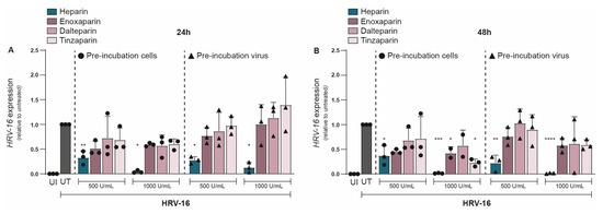 Antiviral effect of heparin but not LMWHs on HRV-16 replication. Either H1-HeLa cells (round) or HRV-16 particles (triangle) were pre-incubated with two different concentrations (500 IU/mL and 1000 IU/mL) of heparin (blue bar), or LMWHs enoxaparin (dark pink), dalteparin (medium pink), or tanzaparin (light pink). Uninfected (UI; white bar) and HRV-16-infected but untreated (UT; gray bar) conditions were taken as controls. HRV-16 RNA expression was quantified at 24 (A) and 48 (B) hpi. using RT-PCR. HRV-16 expression is relative to the housekeeping gene GAPDH, and normalization of values to UT reflects the relative reduction in infection (A,B). The graphs represent collated data (mean ± SD) from 3 independent experiments using two replicates per experiment. A two-way ANOVA with Tukey’s multiple-comparison test was performed for unpaired observations. Statistical significance was set at * p < 0.05, ** p < 0.05, *** p < 0.005, **** p < 0.0005.