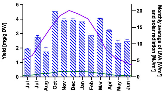 MAAs extraction yield obtained between July 2021 and June 2022, expressed in mg of total MAAs per g dry weight (DW) of alga (blue dashed columns, left axis). The lines represent the monthly averages of total solar radiation (purple; right axis) and UVA radiation (green; right axis) measured over the same time period in the coastal zone of the Biobío region. Solar radiation data were measured by the meteorological station of the Chilean Institute of Agricultural Research (INIA), while surface UVA data are estimated by the NASA CERES and accessed via the POWER Climatology API, Version: v2.5.15 (NASA, 2025).