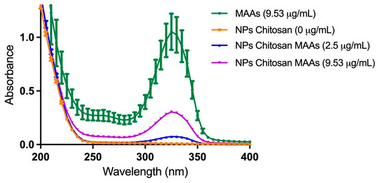 UV-Vis absorption spectra of MAAPE (green), free CSNPs (orange), and CSNPs loaded with 2.5 μg/mL MAAs (blue) and 9.53 μg/mL MAAs (purple).
