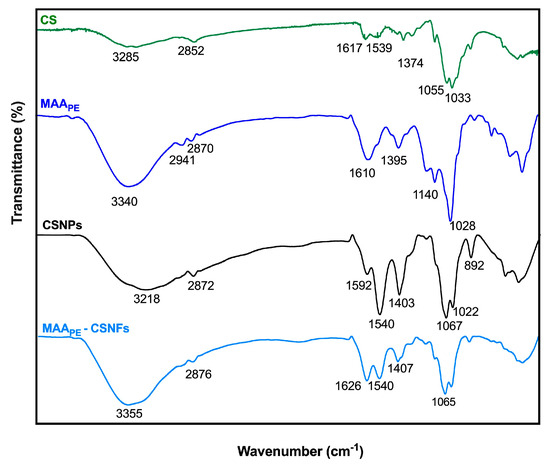 FTIR characterization of CS, MAAPE, CSNPs, and MAAPE-CSNFs is presented in Figure 3. The spectrum of CS (green line) displays a broad peak at 3285 cm−1, which is attributed to the -OH and N-H stretching vibrations of primary amines. This peak becomes more pronounced in the CSNPs (black line), indicating strong hydrogen bonding. In addition, peaks at 1617 cm−1 and 1539 cm−1 in the CS spectrum correspond to C=O and N-H bending vibrations of the residual amide groups from deacetylated chitin. These peaks increase in intensity and shift to 1592 cm−1 and 1540 cm−1, respectively, due to interaction with the phosphate groups from sodium tripolyphosphate (TPP) [29]. Regarding the MAAs spectrum (blue line), a broad peak observed at 3340 cm−1 is attributed to -OH functional groups and N-H stretching vibrations. The peaks at 2941 cm−1 and 2870 cm−1 are associated with C-H stretching vibrations, while the bands at 1610 cm−1 and 1395 cm−1 correspond to -NH2 and -COOH functional groups, respectively. Finally, the spectrum of MAA-CSNFs (light blue line) reveals a characteristic peak at 1626 cm−1 that is specifically associated with the -NH2 groups of MAAs in the nanoformulation, while the broad peak at 3355 cm−1 reflects overlapping -OH and N-H groups from both CS and MAAs.
