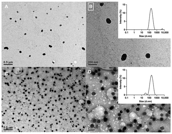 TEM micrographs of CSNPs (A,B) and MAAs-loaded CSNFs (C,D). Inset figures indicate the size distribution of empty (B) and MAAs-loaded (D) nanoformulations.