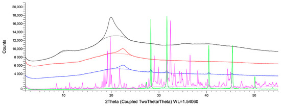 XRD patterns of pure chitosan (black), free CSNPs (red), and CSNPs loaded with MAA extract (blue), MAA extract (purple) and pure TPP (green).