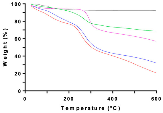 TGA profiles showing mass loss as a function of temperature for pure chitosan (purple), empty CSNPs (red), MAA-loaded CSNPs (blue), MAA extract (green), and pure TPP (black).