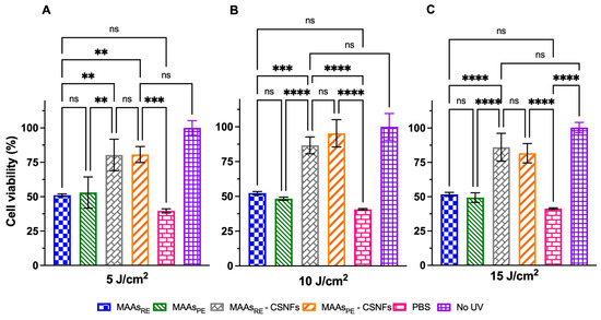 Evaluation of the photoprotective effects of free MAAs (10.2 µg/mL) and CSNFs (10.2 µg/mL MAARE) administered before UVA exposure in HaCaT cells subjected to radiation doses of (A) 5 J/cm2, (B) 10 J/cm2, and (C) 15 J/cm2. Controls included UVA-unexposed cells (violet) and PBS was used as a baseline (red). Columns represent the mean ± s.d. (n = 3). Asterisks denote statistically significant differences between the treatments and controls, ** = p < 0.01, *** = p < 0.001 and **** = p < 0.0001. Non-significant differences are indicated as ns.