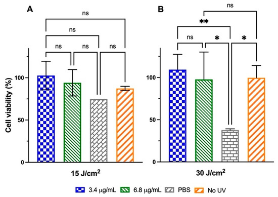 Evaluation of the photoprotective effects of CSNFs containing 3.4 µg/mL (blue) and 6.8 µg/mL (green) of MAARE in HaCaT cells subjected to UVA doses of (A) 15 J/cm2 and (B) 30 J/cm2, under post-treatment conditions. Controls included cells treated with empty CSNPs and UVA-unexposed cells. PBS was used as a baseline control. Columns represent the mean ± s.d. (n = 3). Asterisks denote statistically significant differences between the treatments and controls. * = p < 0.05 and ** = p < 0.01. Non-significant differences are indicated as ns.