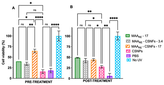 Evaluation of the photoprotective effect of free MMAs (17 μg/mL MAAs) and CSNFs (3.4 and 17 μg/mL MAARE) in HaCaT cells subjected to an UVA radiation dose of 60 J/cm2, under (A) pre-treatment and (B) post-treatment conditions. Controls included cells treated with empty CSNPs and UVA-unexposed cells. PBS was used as a baseline control. Columns represent the mean ± s.d. (n = 3). Asterisks denote statistically significant differences between the treatments and controls. * = p < 0.05, ** = p < 0.01 and **** = p < 0.0001. Non-significant differences are indicated as ns.