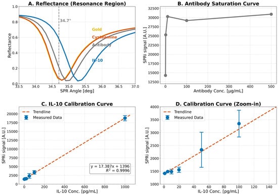 Optimization and calibration of the SPRi biosensor. (A) Reflectance curves in the resonance region, showing the SPR dip shift upon sequential layer formation. The selected measurement angle (34.7°) is indicated by the dashed line. (B) Antibody saturation curve acquired at pH 7.4, used to determine the optimal antibody immobilization concentration. (C) Full calibration curve for IL-10 determination (1–1000 pg/mL) with linear regression fit (R2 = 0.9996). (D) Magnified view of the low-concentration range of the calibration curve.