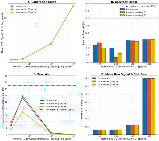 Validation of the biosensor’s analytical performance. (A) Calibration curve for IL-10 on a log-log scale. (B) Accuracy of the method, showing the relative error (bias) for intra- and inter-series measurements at four IL-10 concentrations. The dashed lines indicate the acceptance criterion of ±15%. (C) Precision of the method, showing the coefficient of variation (CV) for the same measurement series. The dashed line indicates the acceptance criterion of 15%. (D) Mean raw SPRi signals and standard deviations for the tested concentration levels.