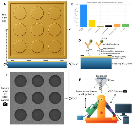 Schematic representation of the SPRi biosensor chip and measurement principle. (A) Top-down view of the 3 × 3 multi-array sensor chip. (B) Comparative thickness of the biosensor layers, illustrating the scale from the glass substrate to the captured analyte. (C) Cross-sectional view of the chip structure along the X-X’ axis. (D) Detailed molecular architecture of the sensor surface, showing the covalent immobilization of the anti-IL-10 antibody via a cysteamine self-assembled monolayer (SAM) and the subsequent specific capture of the IL-10 analyte. (E) Representative image from the CCD camera, showing the SPR signal as dark spots corresponding to the measurement fields. (F) Diagram of the stationary SPRi instrument setup, illustrating the path of the p-polarized laser through the prism to the biosensor surface and the detection of the reflected light by the CCD camera.