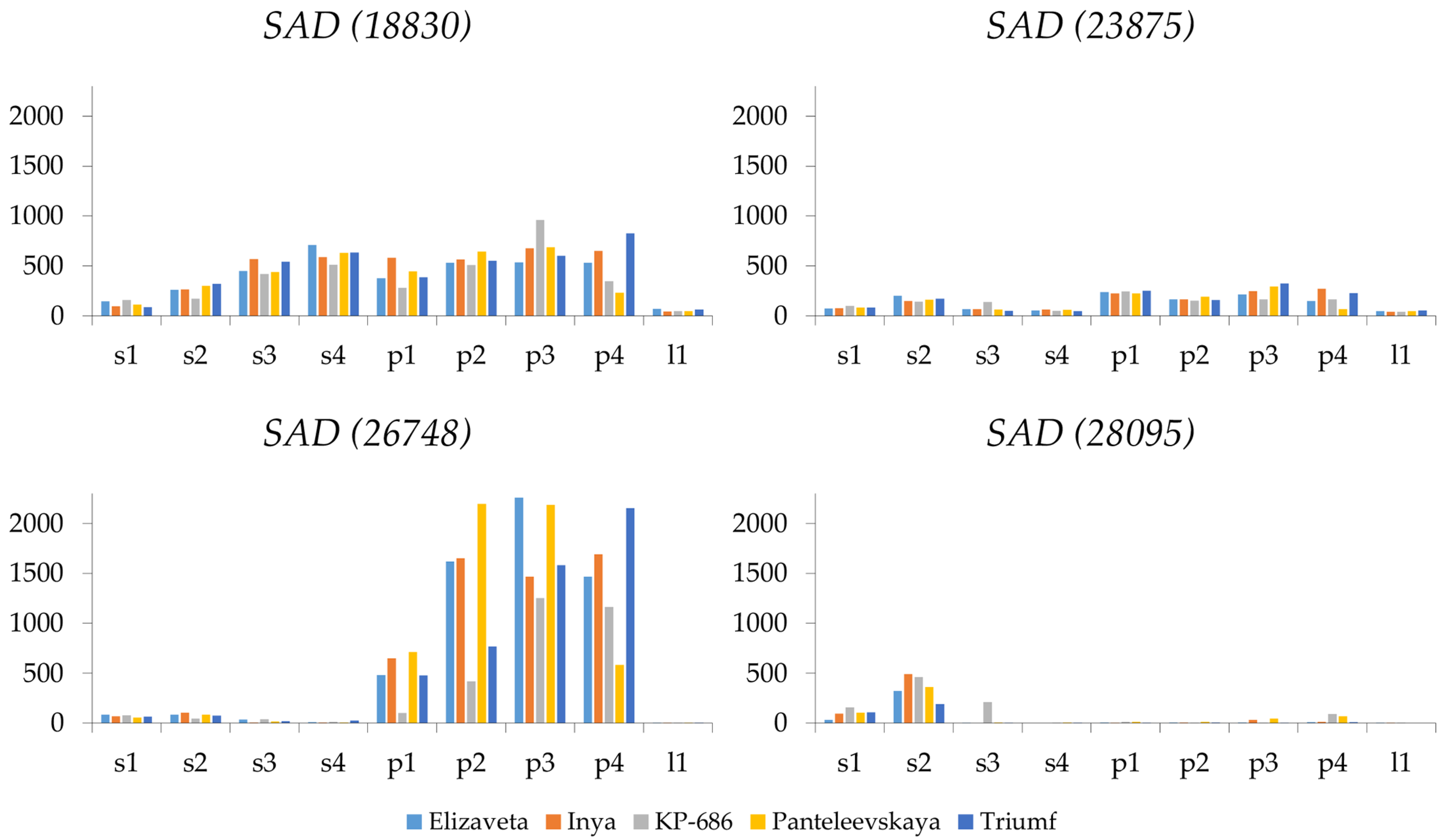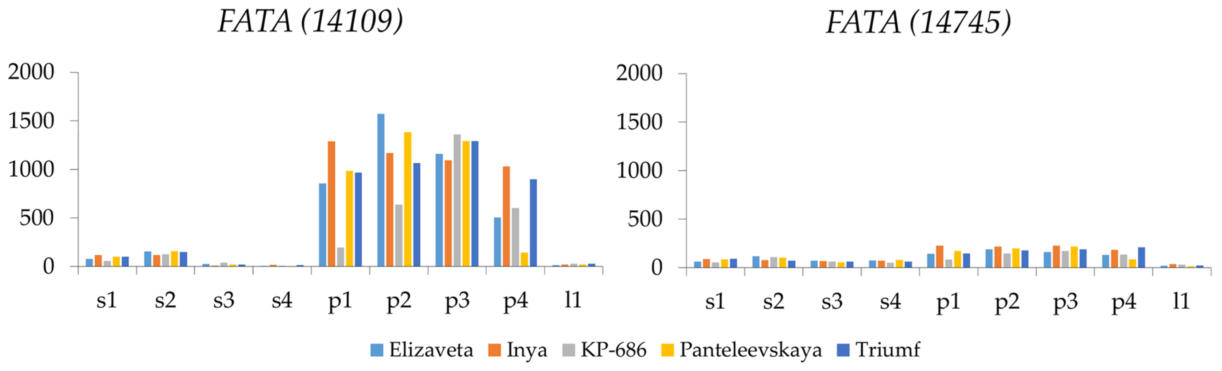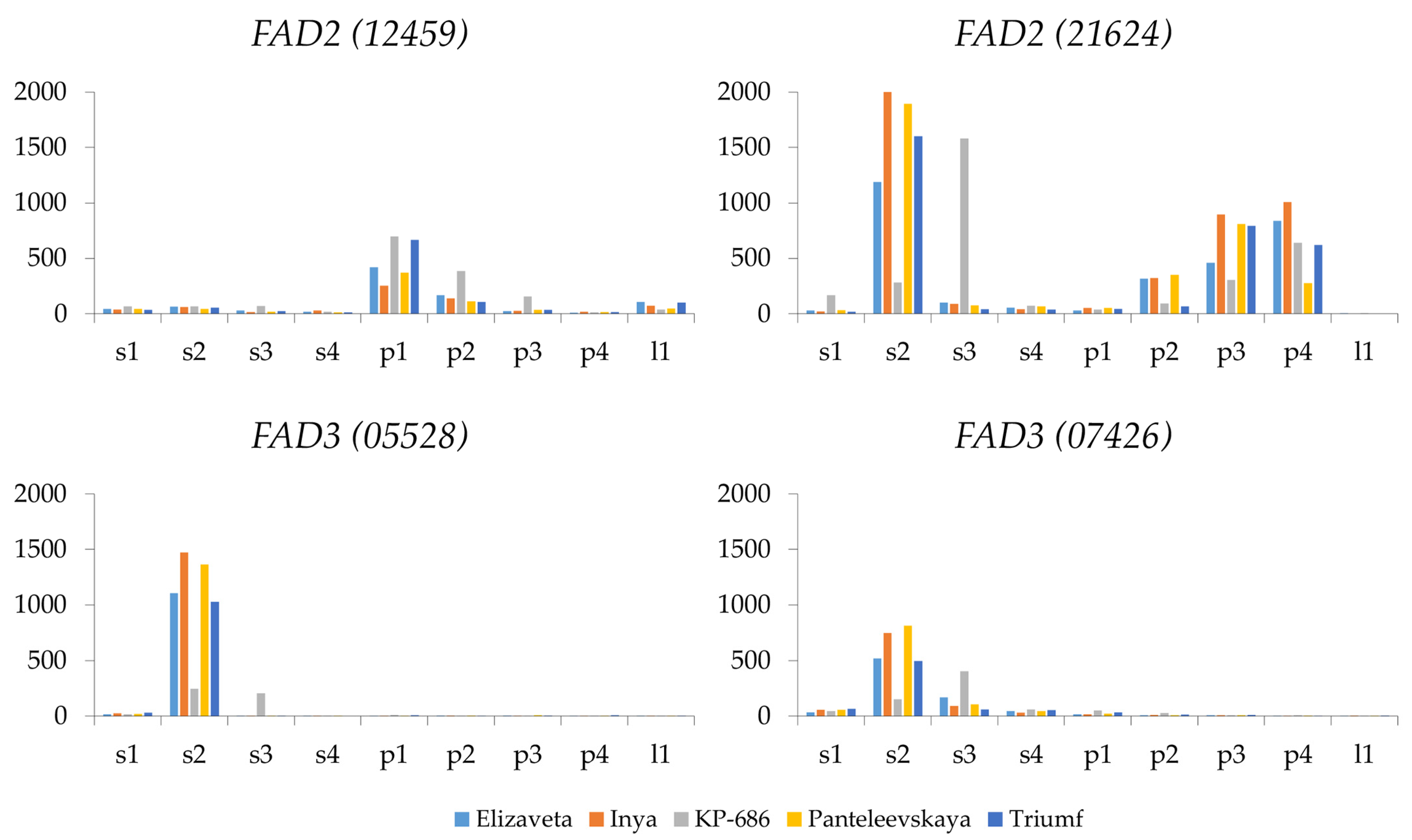 - Pushkova, E.N.; Povkhova, L.V.; Dvorianinova, E.M.; Novakovskiy, R.O.; Rozhmina, T.A.; Gryzunov, A.A.; Sigova, E.A.; Zhernova, D.A.; Borkhert, E.V.; Turba, A.A.; et al. Expression of FAD and SAD Genes in Developing Seeds of Flax Varieties under Different Growth Conditions. Plants 2024, 13, 956. [Google Scholar] [CrossRef] [PubMed]
