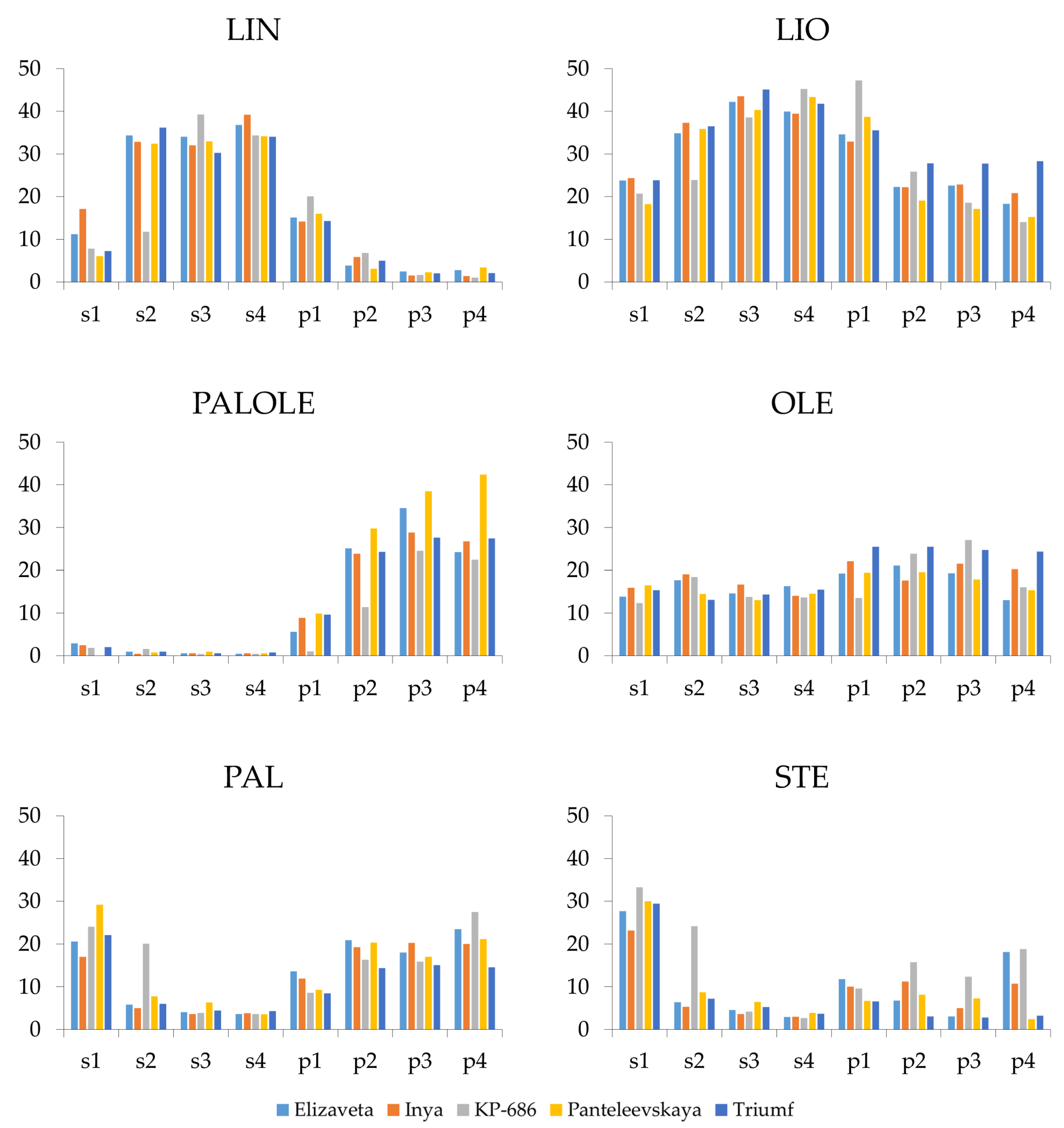 - Zubarev, Y.A.; Gunin, A.V.; Moersel, J.; Zemtsova, A.I. Composition of essential fatty acids in fruit pulp and seeds of sea buckthorn varieties of different ecological origins. In Proceedings of the Collection of Scientific Articles from the International Conference “Lomonosov Readings in Altai: Fundamental Problems of Science and Education”, Barnaul, Russia, 20–24 October 2015; pp. 1588–1594. [Google Scholar]