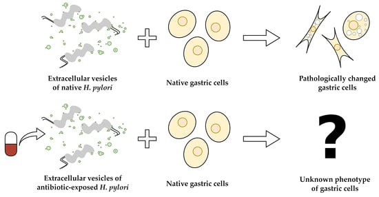 Antibiotics induce a number of changes in the physiology and virulence of microorganisms [,], primarily when used at subinhibitory concentrations []. These modifications can affect both their survival capacity (e.g., biofilm formation) and toxicity (e.g., invasiveness, production of toxins or lytic enzymes) [,,]. Although the impact of antibiotics on microbial vesiculation remails a relatively unexplored research area, there are different scientific reports demonstrating the effect of antimicrobials on the quantity and/or toxicity of EVs towards host cells [,,,,,]. In line with this, we believe that antibiotic-resistant H. pylori constitutes an excellent research model for determining the significance of this phenomenon. Because of the ability to chronically colonize the stomach [], drug-resistant strains of this pathogen can be repeatedly exposed to subinhibitory antibiotic concentrations, which in turn may reduce or enhance the cytotoxicity of their EVs towards gastric cells (Figure 1).