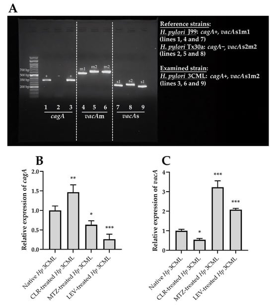Our experiments began by analyzing the toxin profile of H. pylori 3CML. We demonstrated that this strain is capable of producing the CagA toxin (cagA+) and possesses one of the more toxic variants of VacA (vacAs1m2) (Figure 2A). Next, using reverse transcription-quantitative polymerase chain reaction (RT-qPCR), we determined how exposure to subinhibitory concentrations of antibiotics affects the expression of genes encoding these two toxins. We observed an interesting phenomenon, consisting of an increased cagA expression and decreased vacA expression in bacterial cells exposed to CLR, whereas the opposite was noticed for MTZ or LEV (Figure 2B,C). This suggests that subinhibitory concentrations of classically used antibiotics can significantly modulate the toxigenicity of this pathogen.
