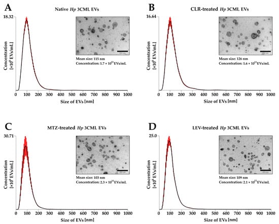 Assessment of biological parameters of extracellular vesicles (EVs) isolated from H. pylori 3CML cultured under antibiotic stress. Bacteria were incubated in BHI + 10% FCS-EVs for 3 days at 37 °C under microaerophilic conditions and were shaked at 100 rpm. Bacteria were (A) not exposed to any antibiotics (native) or treated with ¼× MIC of one of the antibiotics: (B) clarithromycin (CLR), (C) metronidazole (MTZ), or (D) levofloxacin (LEV). The concentration, mean size, and size distribution of EVs were measured using nanoparticle tracking analysis, while their ultrastructure was imaged using transmission electron microscopy. Scale bars, 500 nm.