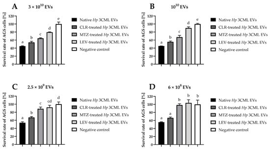Cytotoxicity of extracellular vesicles (EVs) from H. pylori 3CML against the AGS cell line. EVs are coming from native (antibiotic non-exposed) cells or those treated with ¼× MIC of one of the antibiotics: clarithromycin (CLR), metronidazole (MTZ), or levofloxacin (LEV). The negative control constituted a PBS-resuspended sample from BHI + 10% FCS-EVs without bacteria, which was subjected to the similar EVs isolation steps as other samples. AGS cells were co-incubated with (A) 3 × 1010, (B) 1010, (C) 2.5 × 109, or (D) 6 × 108 of H. pylori 3CML EVs. The cytotoxicity level of these structures was assessed using the MTT assay. Values with different letters in columns are statistically different (p < 0.05).