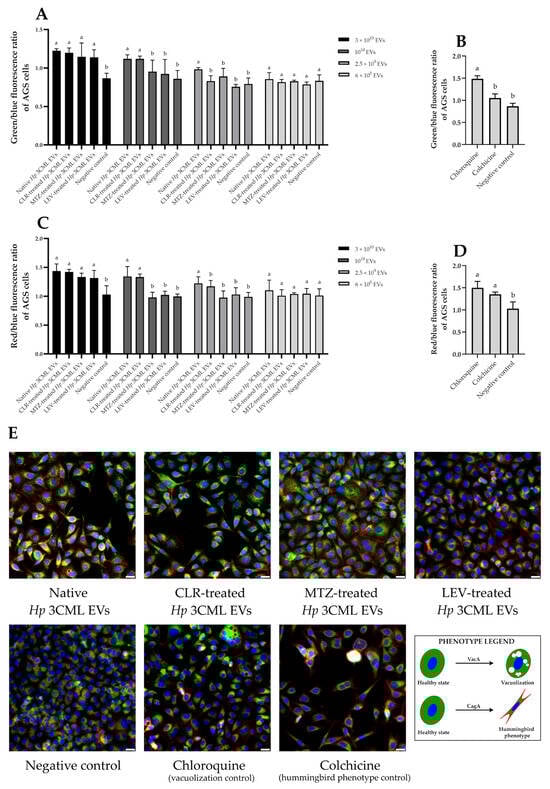 Phenotypic changes in the AGS cell line after 24 h exposure to extracellular vesicles (EVs) from H. pylori 3CML measured by fluorescence microscopy. EVs are derived from native (antibiotic non-exposed) cells or those treated with ¼× MIC of one of the antibiotics: clarithromycin (CLR), metronidazole (MTZ), or levofloxacin (LEV). The negative control constituted a PBS-resuspended sample from BHI + 10% FCS-EVs without bacteria, which was subjected to the similar EVs isolation steps as other samples. Chloroquine (0.1 µM) and colchicine (10 µM) were used as positive controls for vacuolization and hummingbird phenotype, respectively. AGS cells were stained with DAPI (blue), FM 1-43 (green), and phalloidin-conjugated Alexa Fluor 647 (red) to visualize the cell nucleus, cell membrane, and cytoskeleton, respectively. Fluorescence intensity of the cell membrane (A,B) or cytoskeleton (C,D) of AGS cells after exposure to a concentration gradient of H. pylori 3CML EVs or control substances. Values with different letters in columns are statistically different (p < 0.05). (E) Representative fluorescence images of AGS cells treated with 3 × 1010 of EVs or control samples. Scale bars, 50 µm.