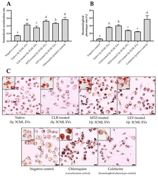 Phenotypic changes in the AGS cell line after 24 h exposure to extracellular vesicles (EVs) from H. pylori 3CML measured by light microscopy and a neutral red staining. EVs are coming from native (antibiotic non-exposed) cells or those treated with ¼× MIC of one of the antibiotics: clarithromycin (CLR), metronidazole (MTZ), or levofloxacin (LEV). The negative control constituted a PBS-resuspended sample from BHI + 10% FCS-EVs without bacteria, which was subjected to the similar EVs isolation steps as other samples. Chloroquine (0.1 µM) and colchicine (10 µM) were used as positive controls for vacuolization and hummingbird phenotype, respectively. (A) Degree of vacuolization or (B) degree of elongation (the hummingbird phenotype) of AGS cells after exposure to 3 × 1010 of H. pylori 3CML EVs or control substances. Values with different letters in columns are statistically different (p < 0.05). (C) Representative images of AGS cells treated with 3 × 1010 of EVs or control samples. Scale bars, 10 µm.