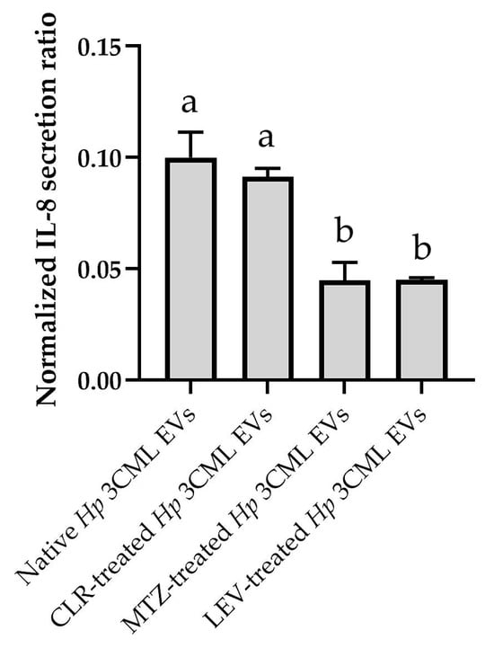Induction of a proinflammatory response in the AGS cell line after 24 h exposure to 3 × 1010 of extracellular vesicles (EVs) from H. pylori 3CML. EVs are coming from native (antibiotic non-exposed) cells or those treated with ¼× MIC of one of the antibiotics: clarithromycin (CLR), metronidazole (MTZ), or levofloxacin (LEV). A commercial IL-8 enzyme-linked immunosorbent assay kit was used to determine the level of this cytokine in the supernatant of AGS cells. The obtained data were normalized to the absorbance values acquired in the MTT assay. In each case, the values obtained for the tested samples were subtracted from the negative control results. Values with different letters in columns are statistically different (p < 0.05).