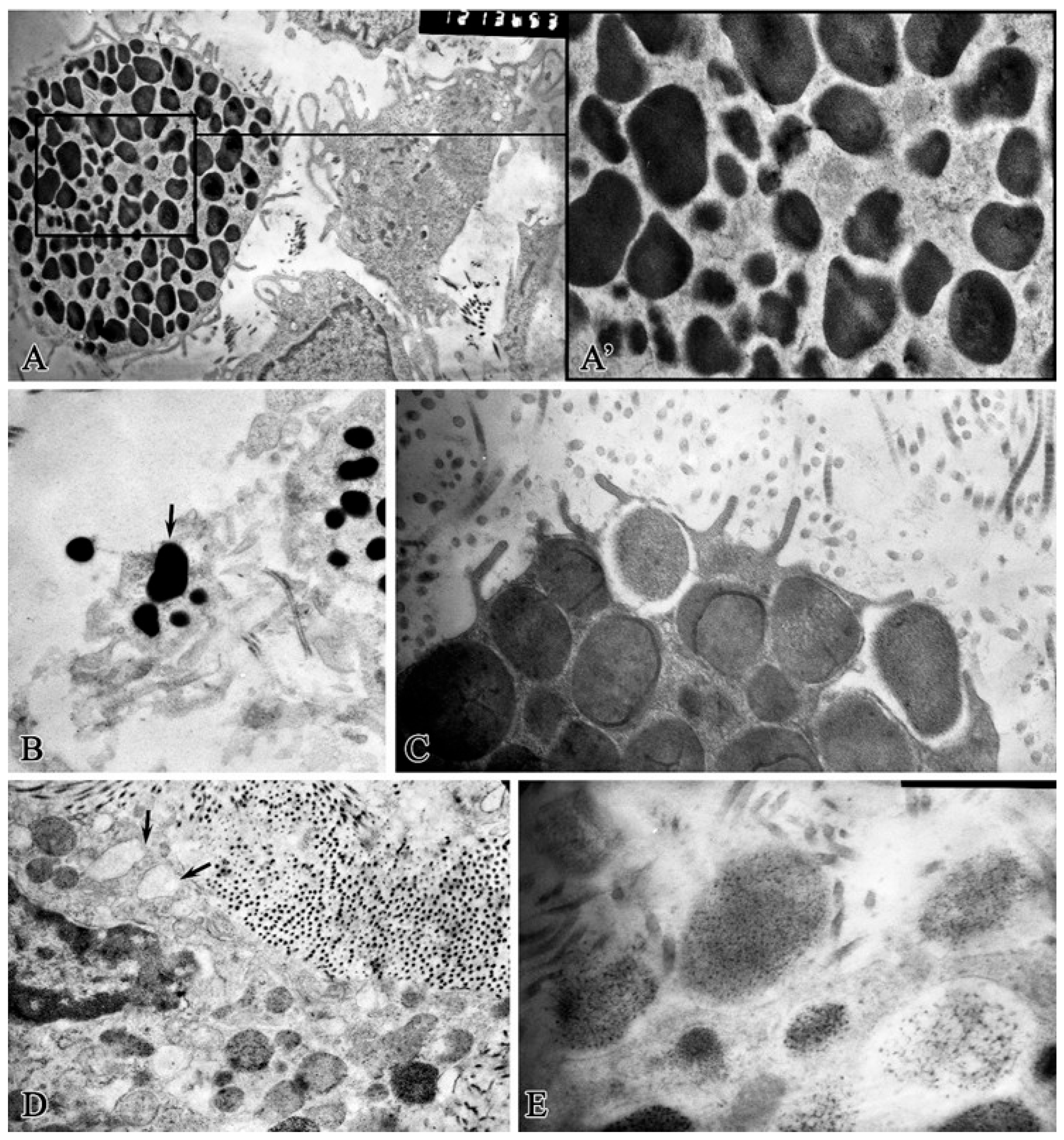 - Crivellato, E.; Nico, B.; Mallardi, F.; Beltrami, C.A.; Ribatti, D. Piecemeal degranulation as a general secretory mechanism? Anat. Rec. A Discov. Mol. Cell Evol. Biol. 2003, 274, 778–784. [Google Scholar] [CrossRef]