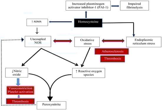 Oxidative stress caused by increased levels of Hcy promotes endothelial dysfunction and thrombosis through reactive oxygen species. Moreover, homocysteine increases asymmetric dimethylarginine (ADMA) levels, which may uncouple nitric oxide synthase (NOS), reducing nitric oxide (NO) production and increasing superoxide levels. The reaction between superoxide and NO forms peroxynitrite, decreasing NO availability and contributing to endothelial dysfunction. Additionally, peroxynitrite may further uncouple NOS. Hcy can also interfere with the body’s ability to dissolve clots by increasing plasminogen activator inhibitor-1 levels (PAI-1). PAI-1 inhibits fibrinolysis by reducing plasmin formation.