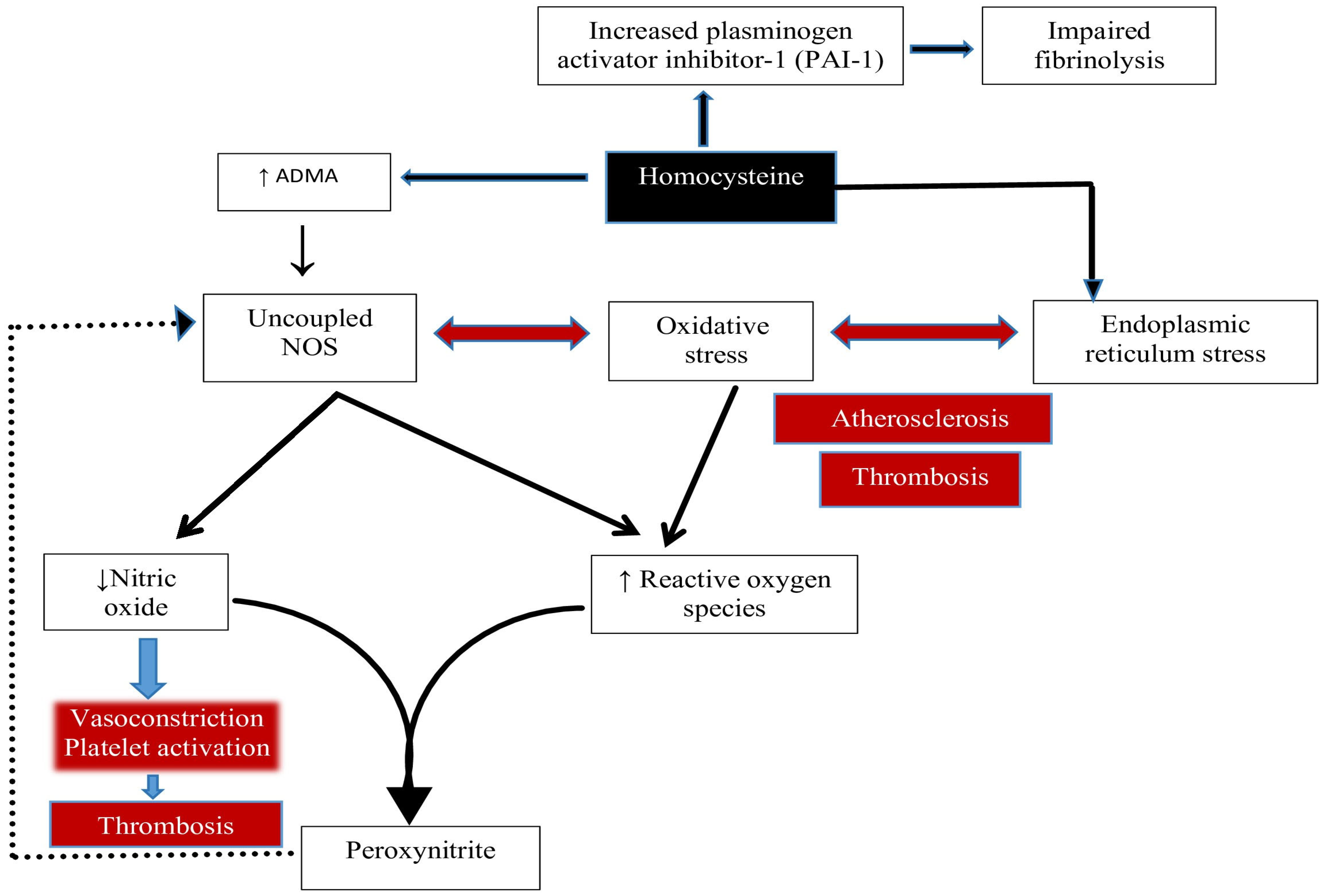 - ADMA-Mediated NOS Inhibition: Hcy promotes production of asymmetric dimethylarginine (ADMA), an endogenous nitric oxide synthase (NOS) inhibitor [56].