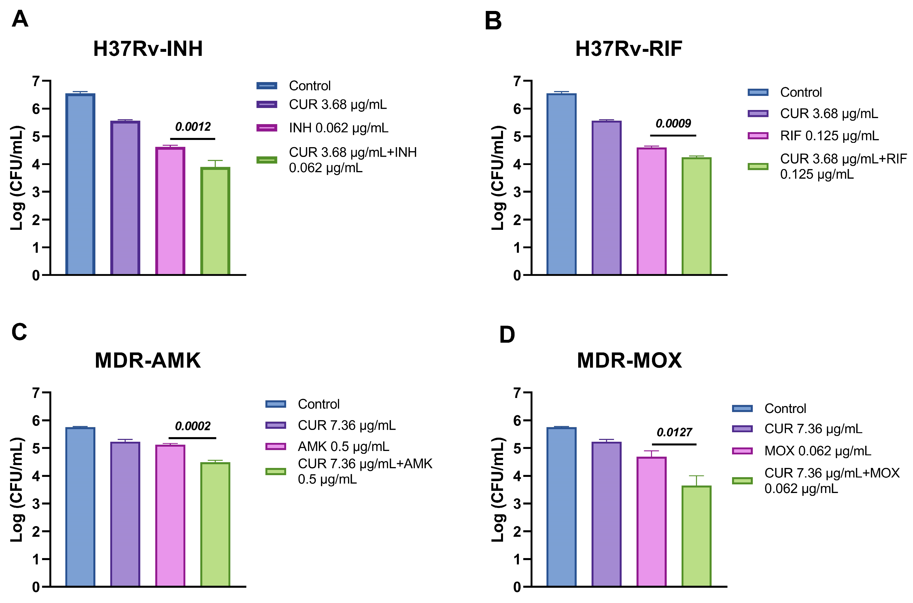 | H37Rv | CUR | 3.68 μg/mL | 1.84 μg/mL | 1 | Additive |