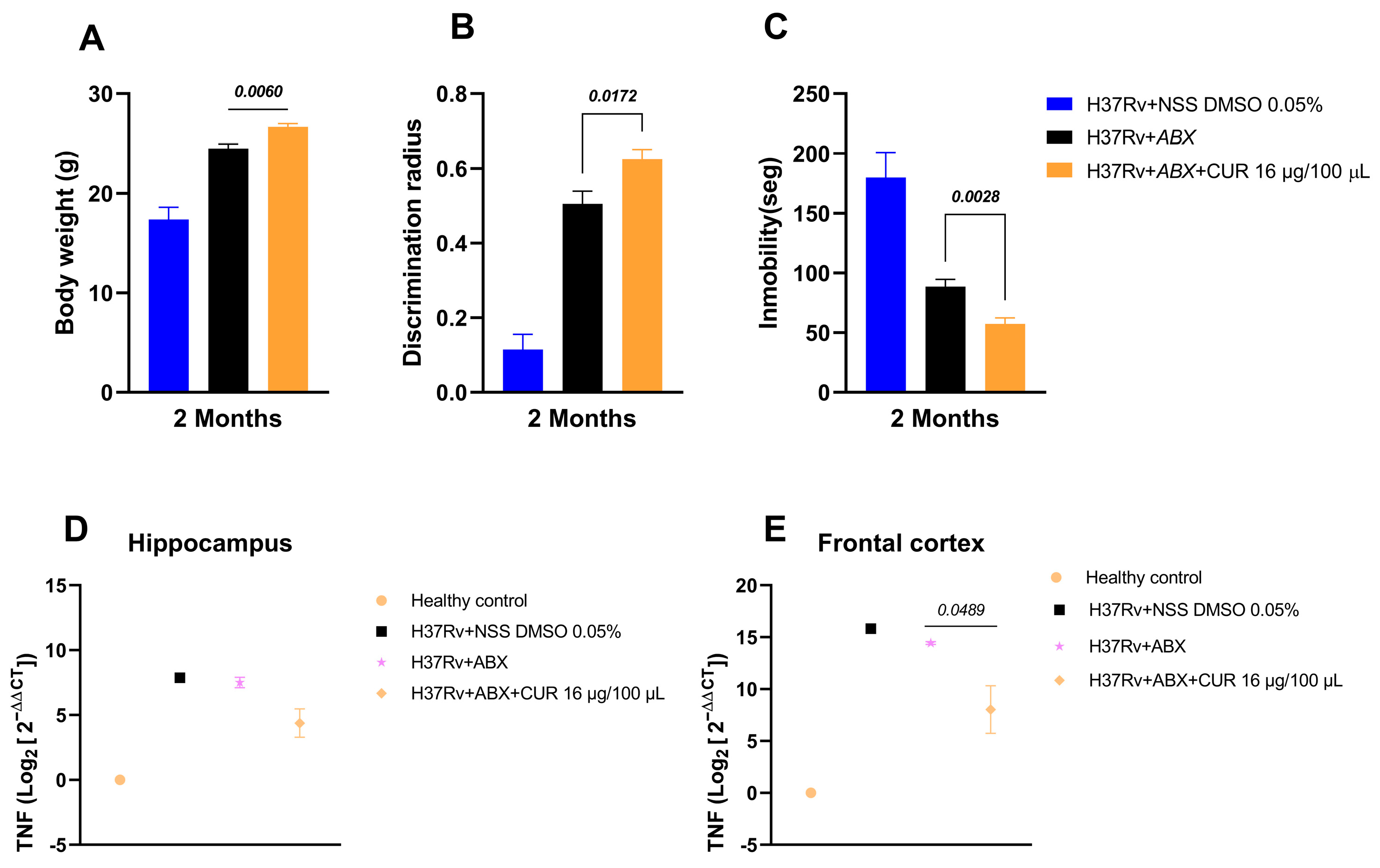 2.5. Effect of Curcumin Administration in Combination with ABX on the Sickness Behavior of Mice with Advanced TB