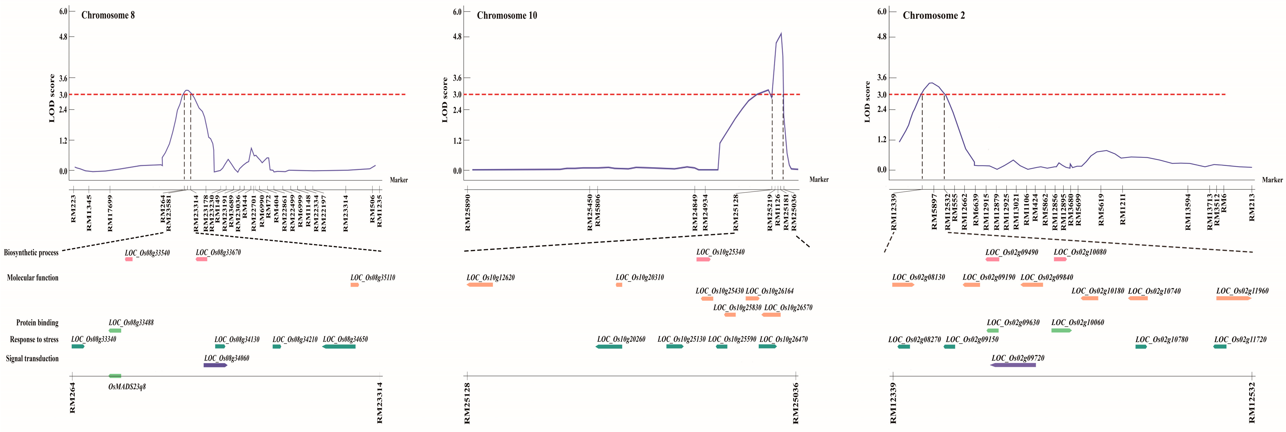 - Kim, N.; Jan, R.; Park, J.-R.; Asif, S.; Zhao, D.-D.; Kim, E.-G.; Jang, Y.-H.; Eom, G.-H.; Lee, G.-S.; Kim, K.-M. QTL mapping and candidate gene analysis for seed germination response to low temperature in Rice. Int. J. Mol. Sci. 2022, 23, 7379. [Google Scholar] [CrossRef] [PubMed]