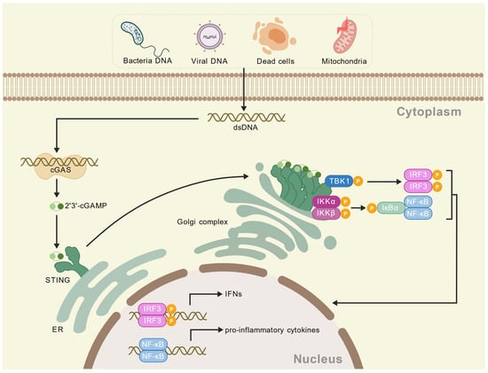 The innate immune system is a frontline defense against microbial invasion. Among its components, pattern recognition receptors (PRRs), including the Toll-like receptors (TLRs) family and Toll/interleukin-1 receptor (TIR) family [], represent the most extensively studied class of cell membrane receptors. Upon recognition of pathogen-associated molecular patterns (PAMPs), PRRs are activated and subsequently initiate downstream inflammatory cascades, which may ultimately contribute to the development of various inflammatory pathologies. Cytoplasmic double-stranded DNA (dsDNA) sensor cyclic GMP-AMP synthase (cGAS) was initially identified as a key mediator in the induction of IFN-I and nuclear factor-kappa-B (NF-κB) p65 responses []. The cGAS-STING signaling pathway can recognize both exogenous and endogenous DNA. Upon DNA recognition, cGAS produces 2′ to 3′ cyclic GMP-AMP (cGAMP) as a second messenger, which binds to and activates the stimulator of interferon genes (STING, also known as TMEM173, ERIS, MPYS, and MITA) []. This process activates TANK-binding kinase 1 (TBK1), leading to the phosphorylation of interferon regulatory factor 3 (IRF3) and NF-κB, subsequently inducing IFN-I responses [] (Figure 1).