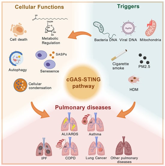 Future research should focus on further exploring the interactions of this pathway with other pathways involved in different lung diseases, as well as the potential for developing targeted drug development and evaluating their clinical outcomes in trials. The combination of cGAS-STING targeted therapy with other therapeutic modalities has been demonstrated to have significant therapeutic potential. Therefore, exploring more combination therapies is necessary. For example, the combination of cGAS-STING pathway agonists and ICIs has demonstrated significant potential in the treatment of lung cancer. The STING signaling pathway has been demonstrated to enhance tumor immune surveillance by promoting tumor T cell infiltration [] and increasing the expression of antigen-presenting molecules []. As previously mentioned, the cGAS-STING pathway plays a dual role in the pathogenesis of IPF; this phenomenon highlights the pathological complexity and microenvironment-dependent nature of different lung diseases, representing a critical direction for future research, such as diverse cellular functions and the impacts of specific modes of activation.