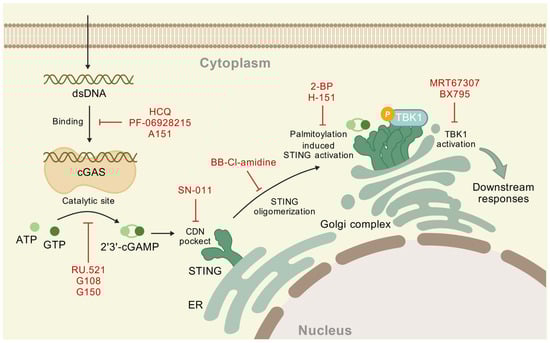 However, the concrete mechanisms underlying these processes had remained unclear until Sun [] et al. identified cGAS. The C-terminus of human cGAS (h-cGAS) can bind to the sugar-phosphate backbone of DNA in the cytoplasm and produce cGAMP to activate this pathway []. cGAMP contains two phosphodiester bonds: one is between GMP’s 2′OH and AMP’s 5′phosphate, and the other is between AMP’s 3′OH and GMP’s 5′phosphate []. Furthermore, the synthesis of cGAMP is considered a crucial step in this process. Although transient activation of STING can produce anti-viral or anti-inflammatory effects, persistent activation can lead to the development of inflammatory diseases.