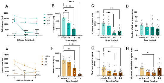 Following the completion of preliminary affinity testing, we commenced behavioral testing, initially investigating spontaneous activity and anxiety-like behavior. According to the results of previous experiments [9], the ED50 value of the open-field test in ICR mice was 1.38 mg/kg after intraperitoneal injection of 5F-EDMB-PICA for 30 min, based on which the experimental doses were selected, two hours after i.p. administration of 5F-EDMB-PICA (0.3, 1 and 2 mg/kg), each mouse was sequentially placed in an open-field chamber and then on an elevated plus-maze for assessment of spontaneous activity and anxiety-like behavior in order to explore the locomotor activity and anxiety in mice of different age groups. The results showed that at 2 h after the injection of 0.3 mg/kg, the difference between the sub-distance and total distance of 5 min block in adolescent mice was statistically significant (F (3,20) = 66.87, p < 0.0001) (Figure 2A,B), and the difference between the distance of exercise in adult mice and that of the vehicle group was statistically significant at 2 h after the injection of 1.0 mg/kg (F (3,20) = 19.79, p < 0.0001) (Figure 2E,F). In the elevated plus maze, 1.0 mg/kg reduced open-arm dwell time relative to vehicle in both adolescent and adults (F (3,31) = 9.937, p < 0.0001)., (F (3,31) = 0.5942, p = 0.6235) (Figure 2C,G), and the adult mice entering the open arm was also significantly lower (F (3,29) = 4.144, p = 0.0146) (Figure 2H), which was not observed in adolescent mice (Figure 2D).
