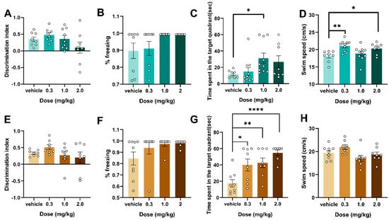 Following an initial exploration of behavioral models, we commenced research into memory across various levels. Two hours post-injection, spatial and recognition memory were compared across age groups using novel-object recognition, contextual fear conditioning and the Morris water maze; outcomes are displayed in Figure 3. In the new object recognition and fear memory extraction experiments, there were no significant changes in mice of different age groups (Figure 3A,B,E,F), and spatial navigation memory was significantly impaired in adolescent mice at a dose of 1 mg/kg (F (3,32) = 2.849, p < 0.05) (Figure 3C); meanwhile, swimming speed was significantly increased at 0.3 and 2.0 mg/kg (F (3,32) = 5.346, p < 0.05) (Figure 3D). In adult mice, there was a statistically significant difference at 0.3 mg/kg compared with the vehicle group (F (3,28) = 7.967, p = 0.05) (Figure 3G), with no significant change in swimming speed (Figure 3H). Also, the experimental results demonstrated that 5F-EDMB-PICA affected spatial memory navigation ability independent of locomotor ability (Figure 3D,H).