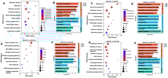 KEGG and GO Enrichment Analyses on the Age-Specific Effects of 5F-EDMB-PICA in Mice. Functional enrichment analyses were performed on all differentially expressed genes (DEGs). These DEGs were obtained from RNA sequencing (RNA-seq) data of hippocampal tissues—collected from mice of varying age groups that had been treated with either 5F-EDMB-PICA (at a dose of 2 mg/kg via intraperitoneal injection) or a vehicle control. Relevant results from these analyses are presented in Figure (A,B). Figure (C,D) display the KEGG pathways or GO terms (with adjusted p-value [Padj] < 0.05) associated with differentially expressed genes in mice of different age groups, respectively, at 2 h after 5F-EDMB-PICA administration (2 mg/kg, intraperitoneal injection). Corresponding KEGG pathways or GO terms (Padj < 0.05) for the vehicle control groups in adolescent and adult mice are presented in Panels (E–H). Data analyses were performed as outlined in Section 4.9. (Abbreviation notes for the figure: Pathways of neuro…: Pathways of neurodegeneration-multiple diseases; Herpes simplex virus…: Herpes simplex virus 1 infection; Amyotrophic lateral …: Amyotrophic lateral sclerosis; Bacterial invasion …: Bacterial invasion of epithelial cells).
