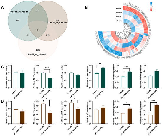 Gene Expression Variations in Adolescent versus Adult Mice Exposed to 5F-EDMB-PICA. (A) Venn diagram was employed to analyze the gene set distributions across distinct experimental groups. (B) Heatmap illustration of transcriptional changes in 171 overlapping genes, comparing adolescent and adult mice treated with 5F-EDMB-PICA or the corresponding vehicle. In the adolescent (C) and adult (D) mice groups, 5F-EDMB-PICA (2 mg/kg, i.p.) and vehicle control were administered to distinct subgroups, respectively. A two-hour interval following treatment elapsed before hippocampal tissues were harvested; subsequently, the expression of specific target genes in these tissues was measured via qRT-PCR. Data assessments were conducted in accordance with the protocol detailed in Section 4.9. All data are presented as mean ± SEM. * p < 0.05, ** p < 0.01, *** p < 0.001 (n = 3 per group).