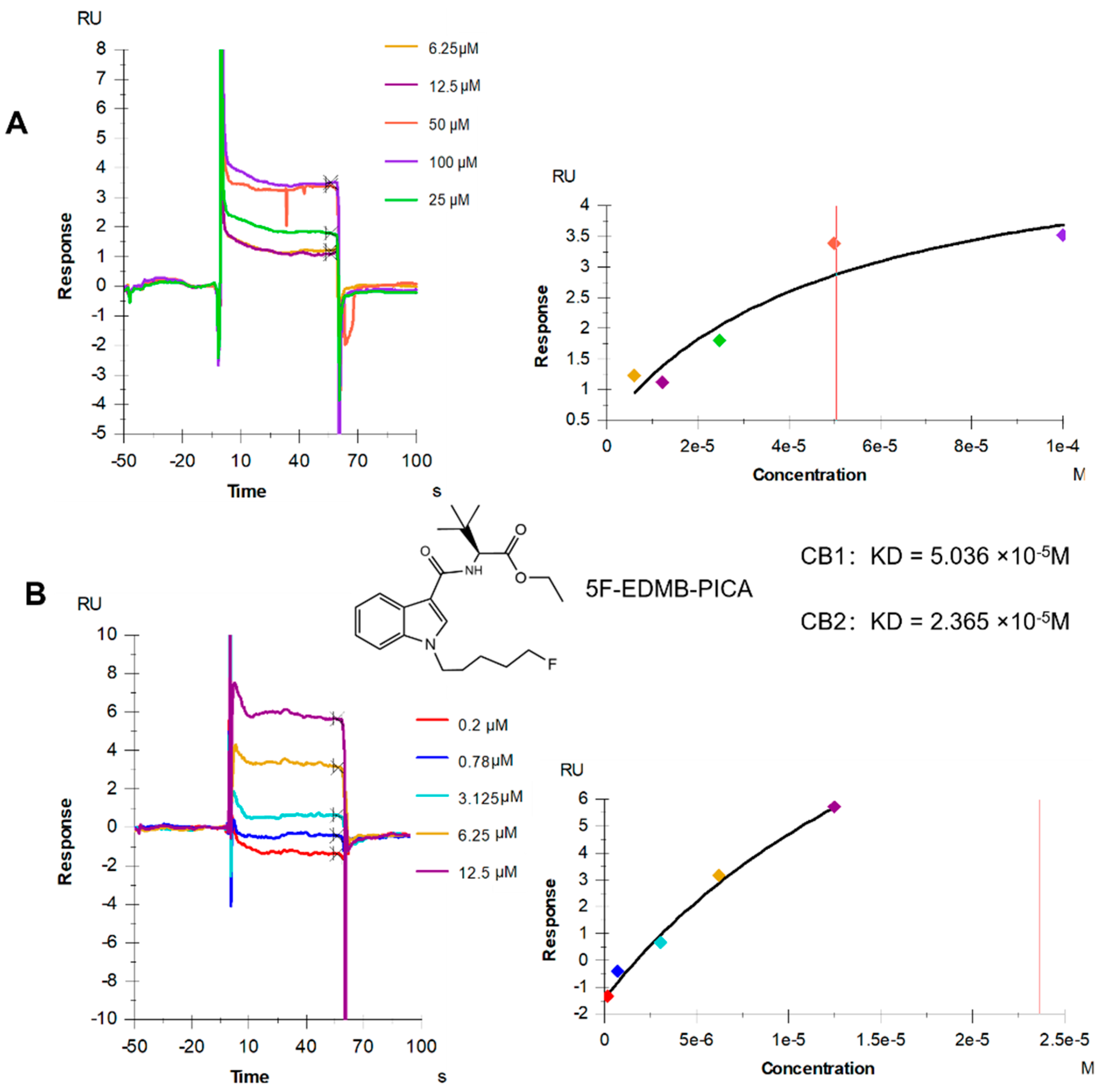 10]. Based on this, we first determined the affinity of 5F-EDMB-PICA for cannabinoid receptors (both CB1 and CB2 receptors) using the SPR technique, and our results showed that it has a strong affinity for both CB1 and CB2 receptors, and its affinity for CB2 is stronger than that for CB1 receptors. Interestingly, similar results were also found in the receptor affinity test of 5F-MDMB-PICA: the EC