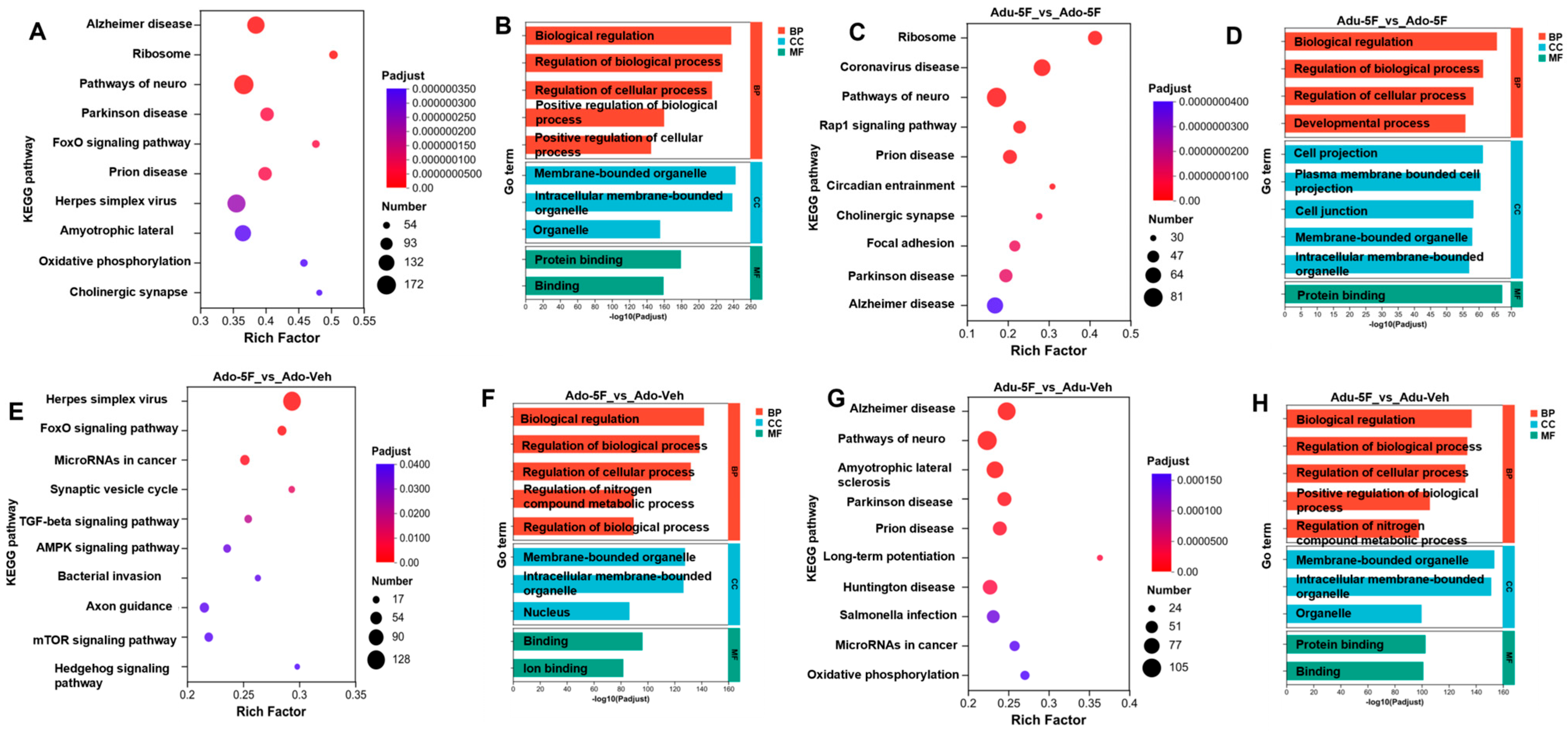 22]. Two hours after administering a single intraperitoneal (i.p.) dose of 5F-EDMB-PICA (2 mg/kg) to mice grouped by age, hippocampal tissues were isolated from these age-stratified animals. Subsequently, bulk RNA sequencing (bulk RNA-seq) was used to characterize the age-specific transcriptional response profiles in the isolated hippocampus. Exposure to 5F-EDMB-PICA, a synthetic cannabinoid, triggers complex alterations in multiple signaling pathways. KEGG pathway analysis reveals a striking age-specific divergence in the biological responses of adolescent and adult mice to this compound. In adult mice, the significantly enriched pathways are predominantly associated with neurodegenerative disorders, including Alzheimer’s disease, Parkinson’s disease, and other neurological conditions. This indicates that 5F-EDMB-PICA may disrupt central nervous system homeostasis, potentially accelerating the progression of neurodegenerative processes. Conversely, adolescent mice exhibit notable activation of pathways related to ribosome function and viral infection responses, such as those associated with coronavirus disease and herpes simplex virus infection. We then re-validated in q-PCR the genes found from the 171 intersecting genes clustering analysis—with initial concordance of expression after drug administration—and found that the