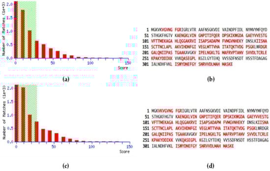 Figure 1. Peptide score distribution resulting from the search in the SwissProt database for GAPDH in healthy samples (a) and periodontopathic samples (c). The x-axis indicates the probability-based mowse score, and the y-axis the numbers of hits. Protein sequence coverage: the matching peptides are shown in bold red, corresponding to 68% in healthy controls (b) and 67% in PD patients (d).