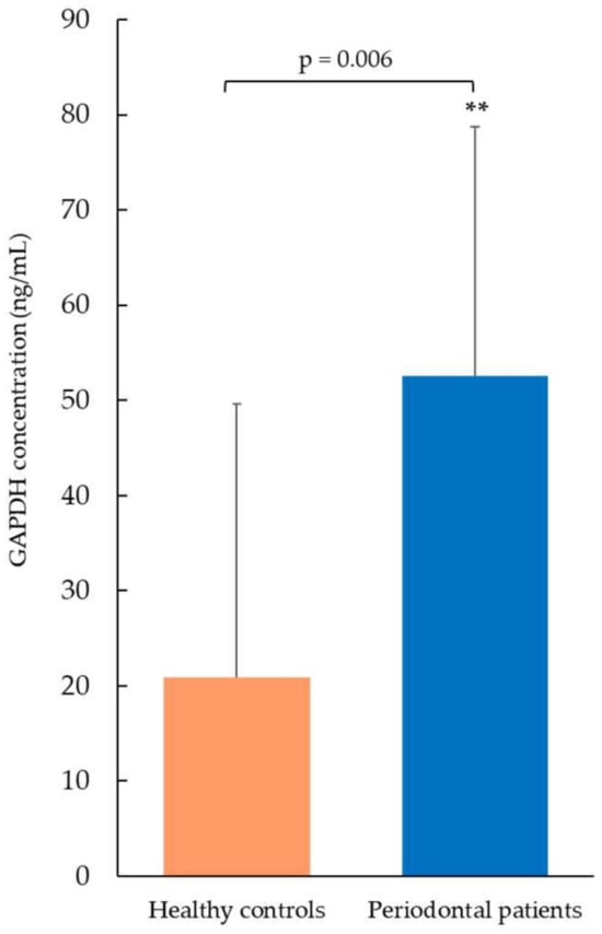 Figure 2. GAPDH concentration measured by ELISA test. Periodontal patients showed significantly increased salivary GAPDH levels compared to healthy controls (** p < 0.01). Data are expressed as mean ± SD, and statistical differences were obtained by Student’s t-test.