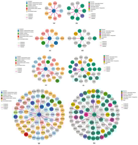 Figure 3. GAPDH interaction networks from different databases colored according to subcellular location and protein class, respectively, for the first-level consensus (a,b), OpenCell (c,d), IntAct (e,f) and BioGRID (g,h). In each network plot, the nodes correspond to genes and edge color refers to the number of datasets to which the interaction belongs.