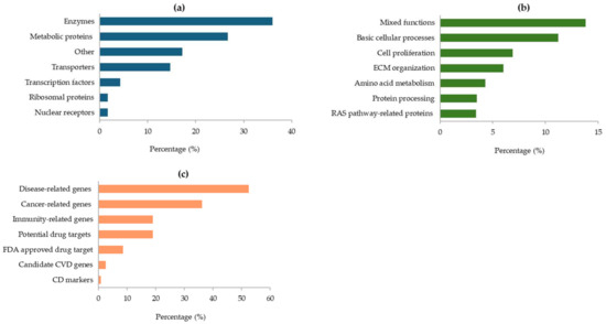 As illustrated in Figure 4, most of the proteins encoded by the GAPDH-related genes are enzymes (36%), other metabolic proteins (27%), or transporters and transcription factors (Figure 4a). At cellular level, their main functions are essentially linked to basic cellular processes, cell proliferation, and organization of the extracellular matrix (ECM) in the connective tissue. Furthermore, some proteins are involved in amino acids metabolism and protein processing, while others are related to the RAS pathway (Figure 4b). In addition, many of the GAPDH-associated genes were found to be correlated with various diseases (53%) and the immune response (19%). Notably, several genes are potential drug targets, and some of them have already been approved by the FDA (Figure 4c).