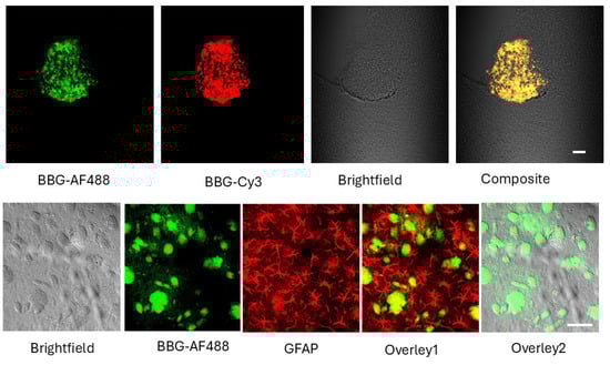 BBG staining of fixed glioma brain sections. Upper panel: Representative images of fixed brain sections from C57Bl/6 mice bearing GL261 gliomas stained with 0.1 mM BBG in PBS and rinsed with ethanol. Brightfield and fluorescence images acquired with Alexa Fluor 488 and Cy3 filter sets illustrate the broad excitation/emission properties of BBG. BBG produced robust labeling of compact clusters of cells with morphology consistent with tumor tissue. Lower panel: Double labeling of glioma sections with BBG and GFAP. Fixed glioma-bearing sections were first immunostained with a rabbit monoclonal anti-GFAP antibody directly conjugated to Alexa Fluor® 594 (detected in the Texas Red channel), followed by post-staining with 0.1 mM BBG. Brightfield and fluorescence images were acquired using Alexa Fluor 488 (BBG) and Texas Red (GFAP) channels. Overlays demonstrate that BBG staining in fixed slices co-localizes with GFAP-positive glioma cells while also lightly labeling additional material within the tumor. Scale bar: 100 µm.
